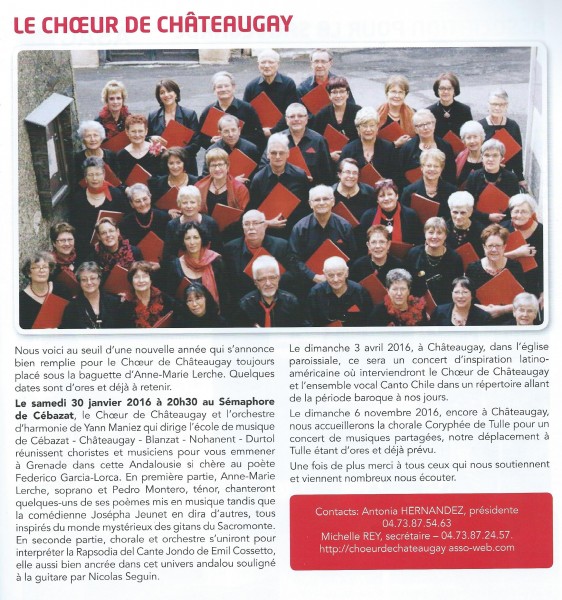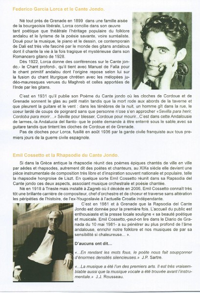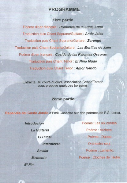 Succès pour l'Ecole Municipale de Musique Vallée du Bédat et le Choeur de Chateaugay qui ont enchanté un public très nombreux venu à Sémaphore pour partager un moment musical fort autour de l'Andalousie et des poèmes de F. Garcia Lorca. En première partie, Josépha Jeunet, Anne-Marie Lerche et Pedro Montero, accompagnés à la guitare par Matthias Collet, nous ont emmenés dans l'univers gitan de l'Andalousie à travers poèmes et chants, pour faire place ensuite à l'oeuvre d'Emil Cossetto : la Rapsodia del Cante Jondo.