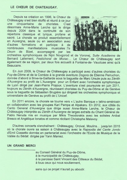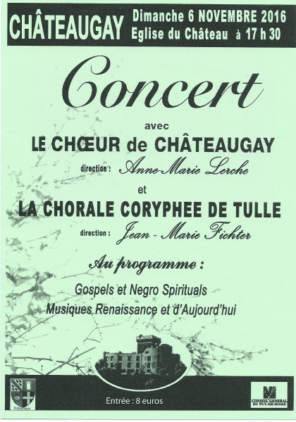 Comme de coutume, c’est à l’Eglise paroissiale que le Chœur de Châteaugay a amorcé sa rentrée. La formation dirigée par Anne-Marie Lerche s’est  produite ce dimanche dans un programme consacré aux negro spirituals. Thème  particulièrement bien accueilli par un public châteaugayre venu nombreux malgré le mauvais temps qui sévissait.