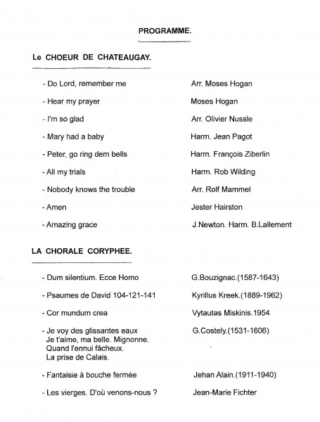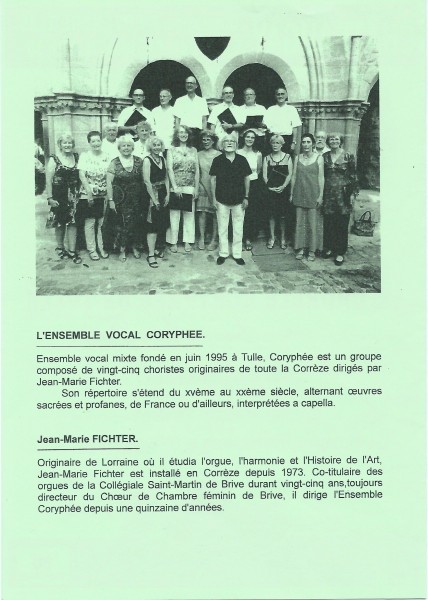 En deuxième partie, dirigée par Jean Marie FICHTER, la chorale Coryphée de Tulle proposait un programme axé sur des chants de la période renaissance mais également d'aujourd'hui. Elle a,  elle aussi,  obtenu un franc succès. Et c’est après 2h de concert que tous les choristes se sont retrouvés autour d’un buffet convivial avant de se séparer et de se promettre un concert en retour à Tulle  au mois de mai prochain .