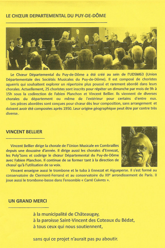 Le 6 octobre, une partie du choeur a participé au quatrième concert donné par le Brass-Band des Volcans à Thiers en l'Eglise Saint-Genès. Puis le 7 octobre, c'est à Châteaugay que le nouveau répertoire du Choeur a été présenté au public châteaugayre, concert apprécié des spectateurs présents. En deuxième partie, c'est la chorale "Au choeur des flots" d'Entraygues-sur-Truyère (Aveyron) qui a présenté son programme, programme qui lui aussi a ravi le public.