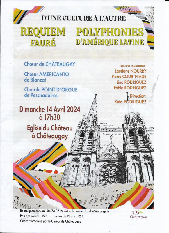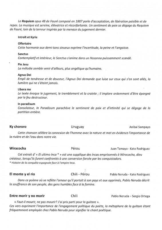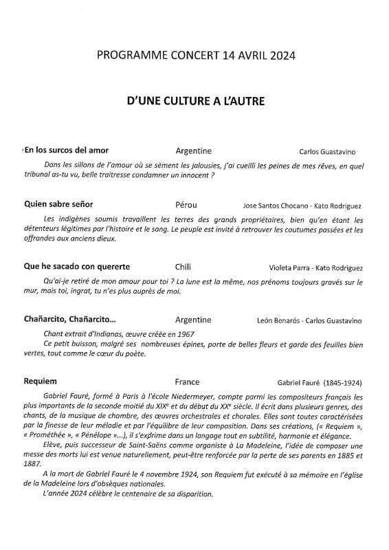 Le programme, intitulé "D'une culture à l'autre", alliait répertoires sud-américain et français, avec le Requiem de Gabriel Fauré, célébrant ainsi le centenaire de sa disparition, et des chants polyphoniques d'Amérique du Sud composés d'après des textes de Carlos Guastavino, Pablo Neruda, Violeta Parra et Juan Tamayo. Concert apprécié par les nombreux spectateurs venus partager avec nous un moment magique de musique. Merci au public, aux musiciens, aux solistes et surtout à notre chef de choeur pour ce merveilleux moment.