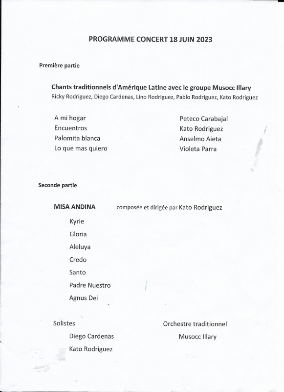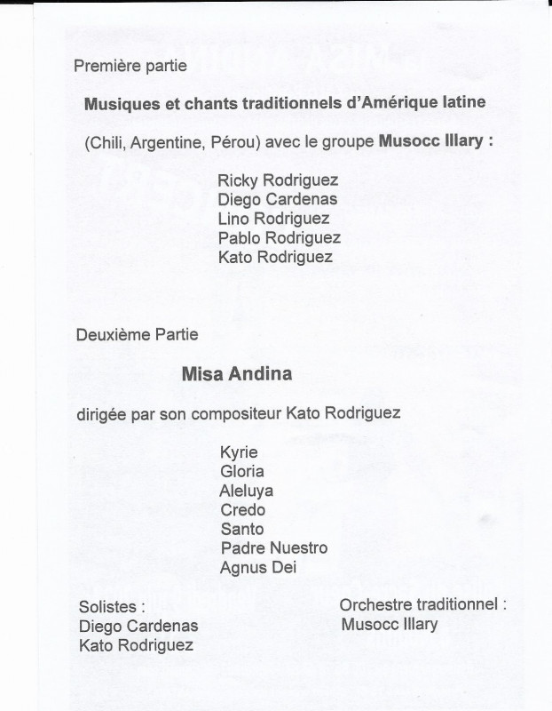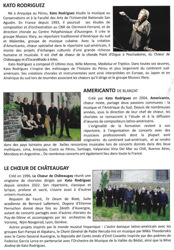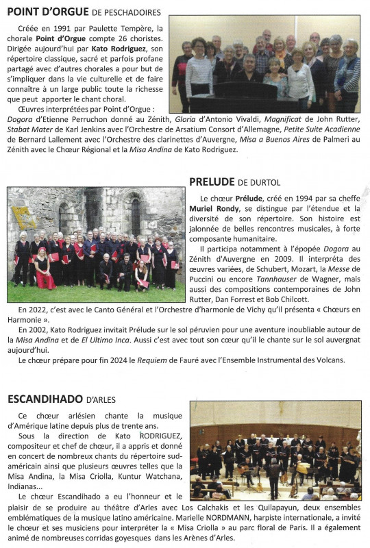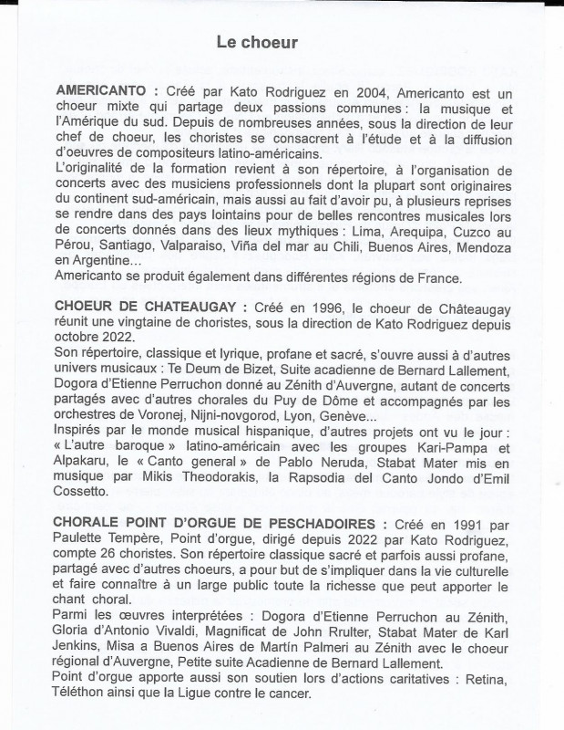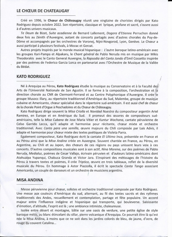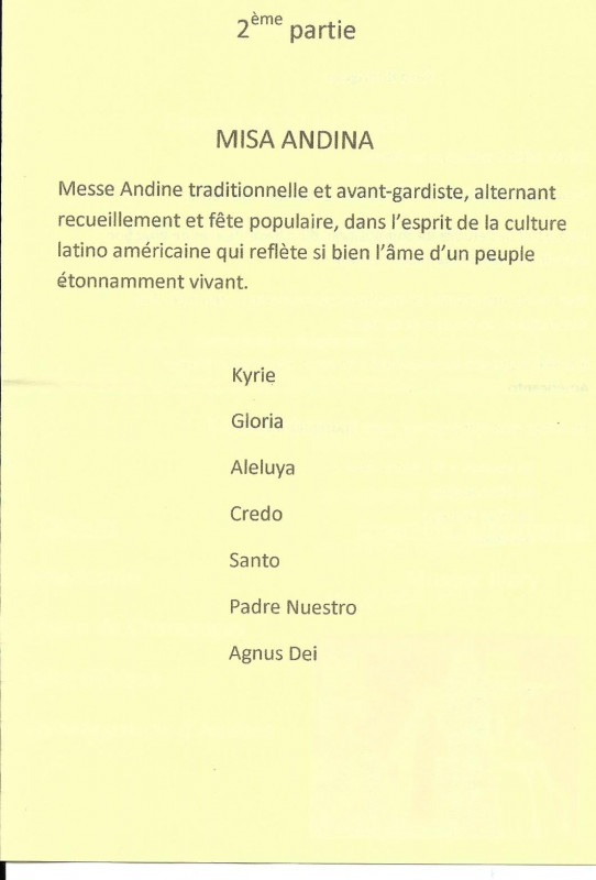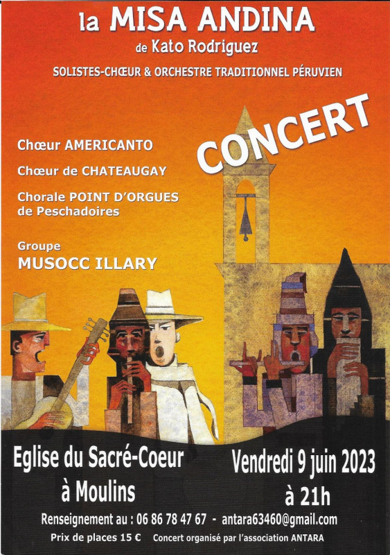 Nous avons donc sous la direction de notre nouveau Chef de choeur Kato, donné plusieurs concerts avec La Misa Andina, le premier de ceux-ci s'est déroulé à Moulins à l'Eglise du Sacré-Coeur et nous avons pu mesurer l'intérêt du public présent pour notre prestation partagée comme indiqué sur le programme avec la Chorale Point d'Orgue de Peschadoires et le Choeur Américanto. En première partie, le groupe Musocc llary a présenté un éventail de musique populaire d'Amérique Latine.