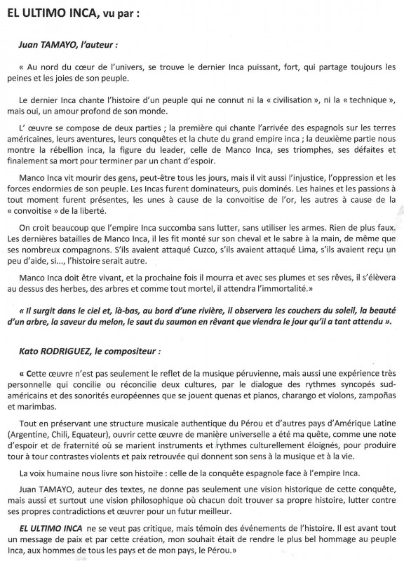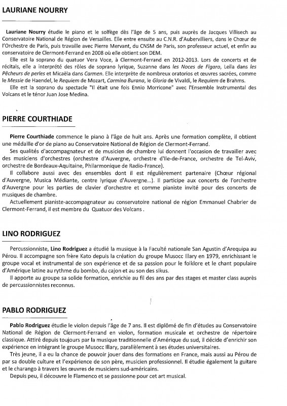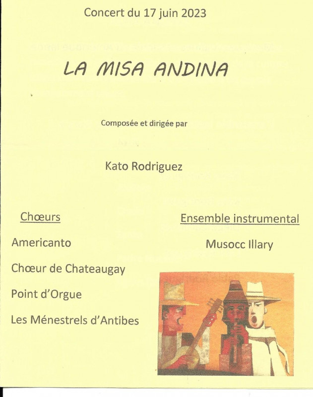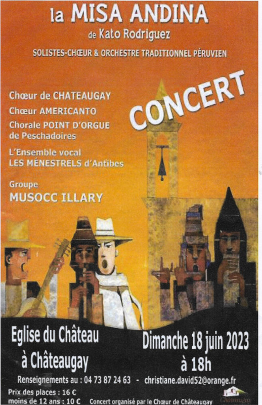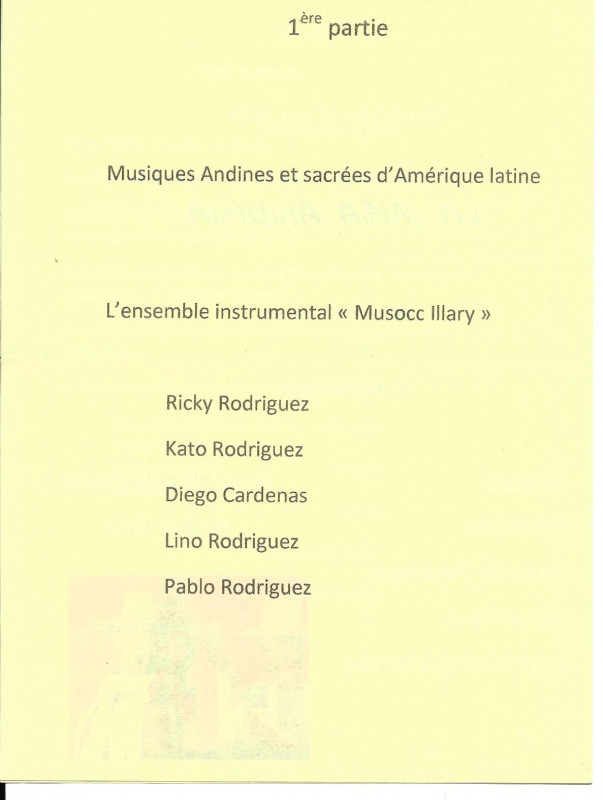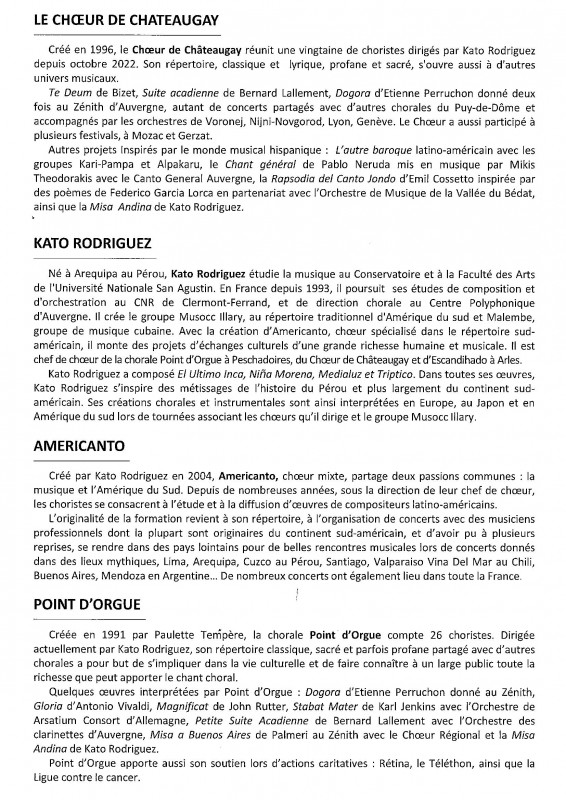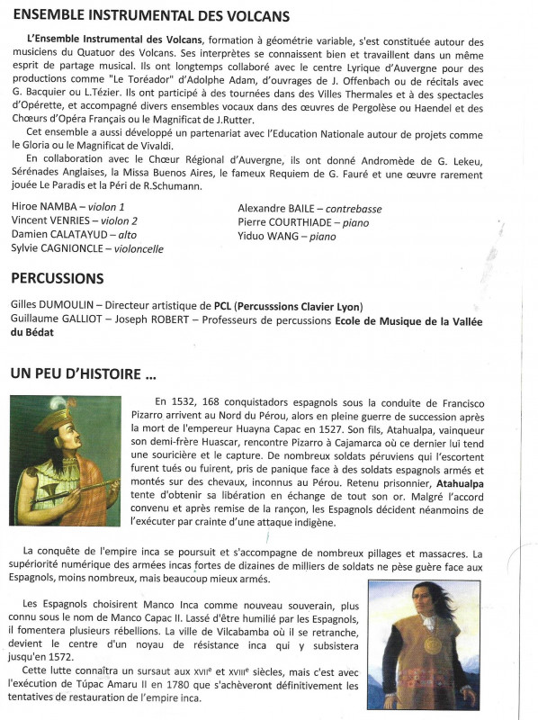 Nous avons donc sous la direction de notre nouveau Chef de choeur Kato, donné plusieurs concerts avec La Misa Andina, le premier de ceux-ci s'est déroulé à Moulins à l'Eglise du Sacré-Coeur et nous avons pu mesurer l'intérêt du public présent pour notre prestation partagée comme indiqué sur le programme avec la Chorale Point d'Orgue de Peschadoires et le Choeur Américanto. En première partie, le groupe Musocc llary a présenté un éventail de musique populaire d'Amérique Latine.