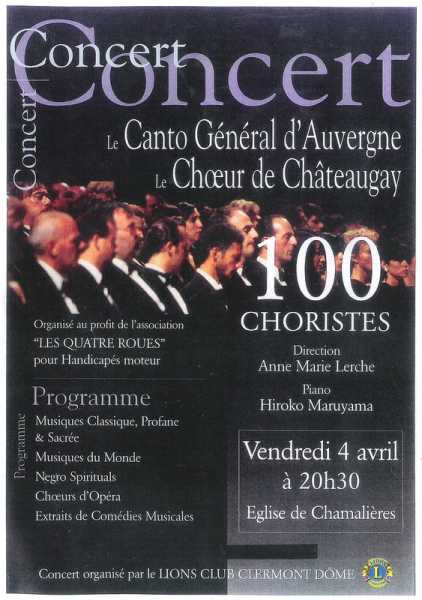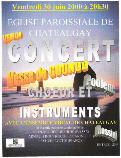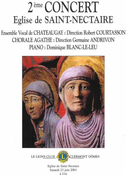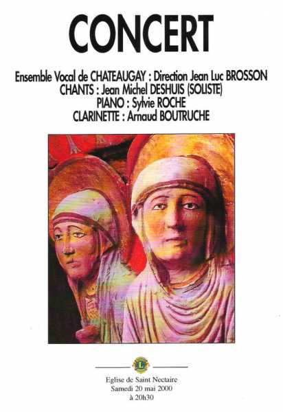Le 20 mai 2000 à l'Eglise de St-Nectaire - concert exceptionnel organisé au profit de l'Enfance Défavorisée. Participants : l'Ensemble Vocal de Chateaugay dirigé par Jean-Luc BROSSON - Jean-Michel DESHUIS (soliste) - Piano : Sylvie ROCHE - Clarinette : Arnaud BOUTRUCHE;