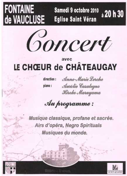 Le 9 octobre 2010, le Choeur s'est produit de nouveau à l'Eglise Saint-Véran de Fontaine de Vaucluse. Au programme de ce concert : "Alle psallite cum luya ..." (Livre Vermeil de Montserrat ), "Prope est Dominus, Motet", "Stabat Mater Dolorosa" (Rheinberger), un duo "Via resti servita" (Noces de Figaro de Mozart), "Liebslieder" Valses (Brahms), duo "Le Violoneux" d'Offenbach, "Vergine degli angeli" de Verdi, "Deep River, Go down, Moses" ainsi que des extraits de Dogora : Tchunga ya !, Kourni, Koshni, Mira, Soutrinka, La vidjiamé, Mie panosko, Donia et Souchanishka.