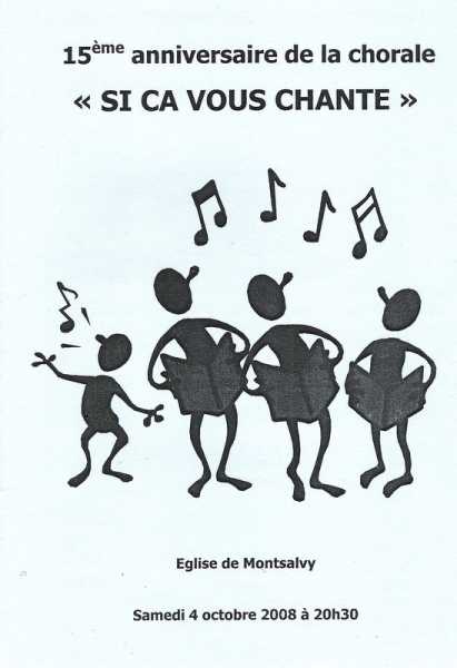 Pour son 15ème anniversaire, le choeur "Si ça vous chante" de Montsalvy reçoit en octobre 2008 le Choeur de Chateaugay. C'est devant un public venu nombreux que les deux choeurs se sont produits faisant partager leurs programmes qui alliaient musiques classique, profane, sacrée et chants du monde.