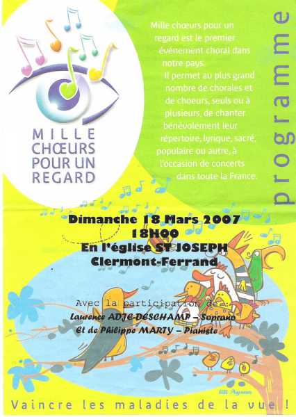 Le 18 mars 2007, à l'Eglise Saint-Joseph de Clermont-Ferrand dans le cadre de l'opération "Mille choeurs pour un regard" avec le Canto Général d'Auvergne, la Chorale Point d'Orgue de Peschadoires et avec la participation de Laurence ADJE DESCHAMPS, Soprano et Philippe MARTY, Pianiste - Direction : Paulette TEMPERE et Anne-Marie LERCHE.