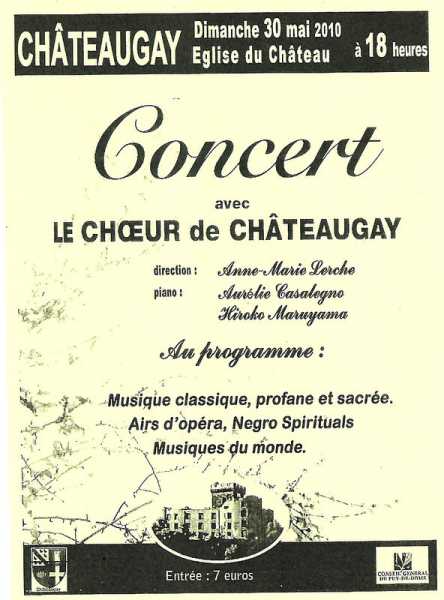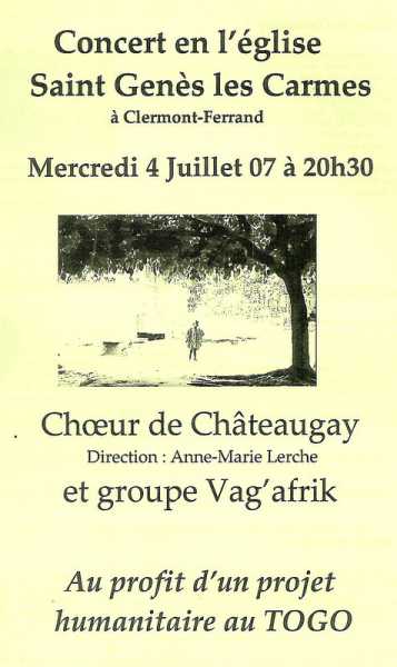à l'Eglise Saint-Genès les Carmes au profit d'un projet humanitaire au Togo. Objectif du groupe Vag Afrik constitué de lycéens de Blaise Pascal et Jeanne d'Arc : apporter leur aide dans la rénovation de trois bâtiments du collège Notre-Dame d'Afrique dans le village d'Atakpamé au Togo. Au programme : travaux de peinture dans 20 classes, badigeonnage des trois bâtiments, etc... Le Choeur de Chateaugay s'est associé à cette oeuvre généreuse par le concert donné le 4 juillet 2007.