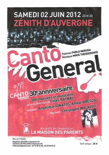 Le 2 juin 2012, le Choeur de Chateaugay a participé à la présentation du "Canto General" au Zénith d'Auvergne.
