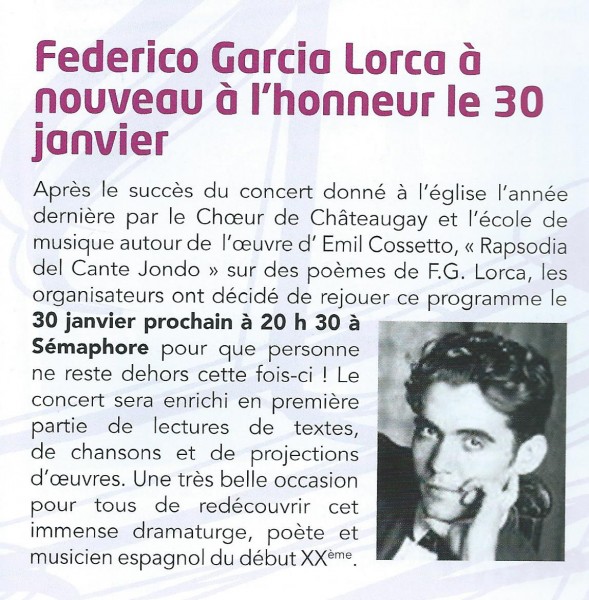 Le Choeur de Chateaugay et l'Orcheste d'harmonie de Yann Maniez, qui dirige l'école de musique de Cébazat-Châteaugay-Blanzat-Nohanent-Durtol, réunissent choristes et musiciens pour vous emmener à Grenade dans cette Andalousie si chère au poète Federico Garcia-Lorca*.